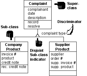 The example models a fragment of a complaint resolution system. It models the fact that a complaint can either be about the company's product or a product purchased by the company from a supplier. The former complaint would originate from a customer, the latter would originate from within the company itself. In both cases the complainant details, date and description of complaint are recorded. These attributes therefore remain with the super-class "complaint" which models the general case. In the special case of the company product however invoice, credit note and product information needs to be recorded. These attributes are therefore modeled as being unique to the "company product" sub-class. In the case of the supplier product, supplier information, order number, supplier invoice and supplier product information must be recorded. These attributes are therefore unique to the "supplier product" sub-class. In both cases the attributes of the super-class "complaint" plus the attributes of the individual sub-classes completely define the attributes of that sub-class.
